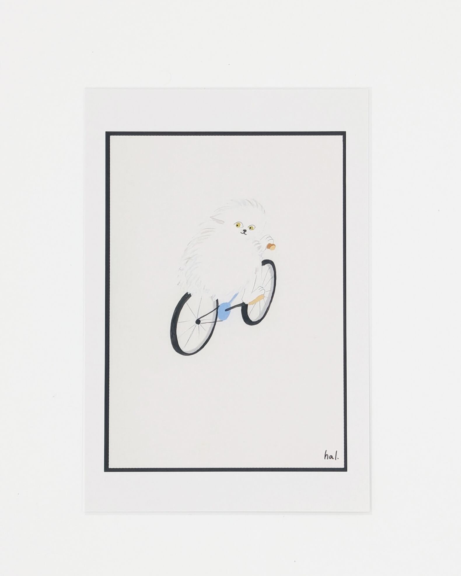 postcard 100mm×148mm title: chari material: acrylic gouache drawing by hal. ・ホワホワの白い猫ちゃんはチャリでどこまで行くのやら